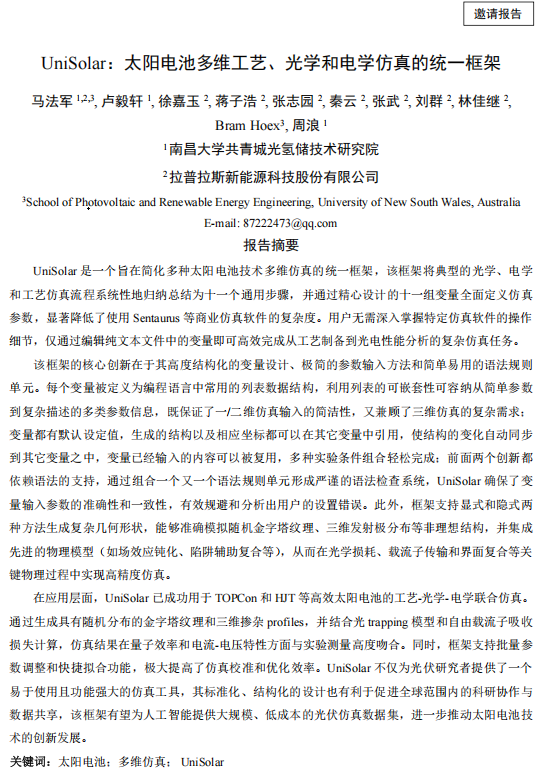 UniSolar:太阳电池多维工艺、光学和电学仿真的统一框架【马法军】
