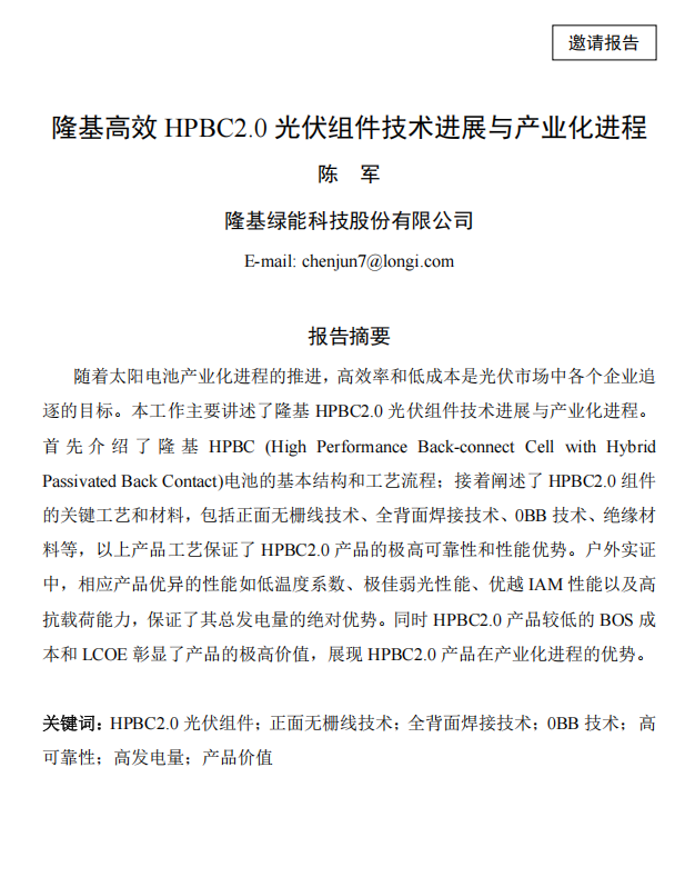 隆基高效 HPBC2.0 光伏组件技术进展与产业化进程【陈军】