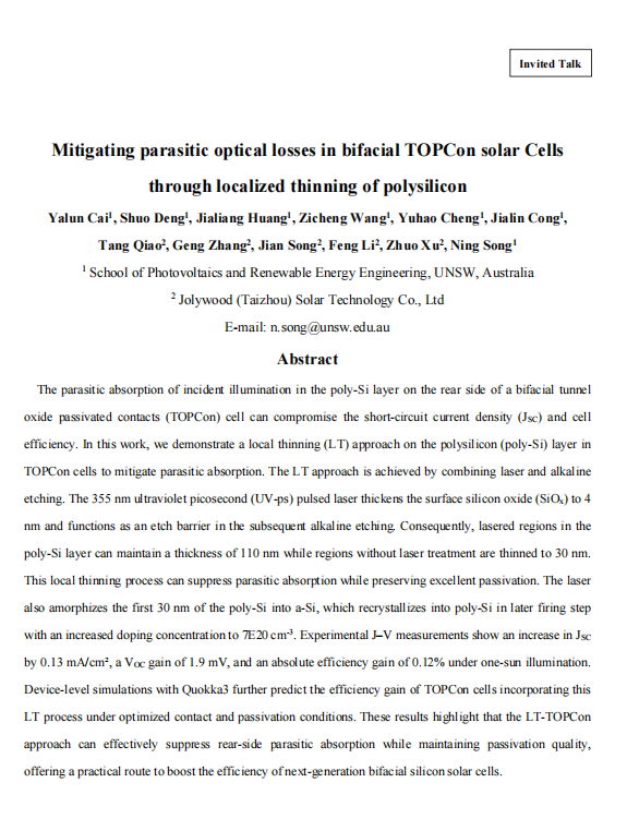 Mitigating parasitic optical losses in bifacial TOPCon solar Cells through localized thinning of polysilicon【Ning Song 】