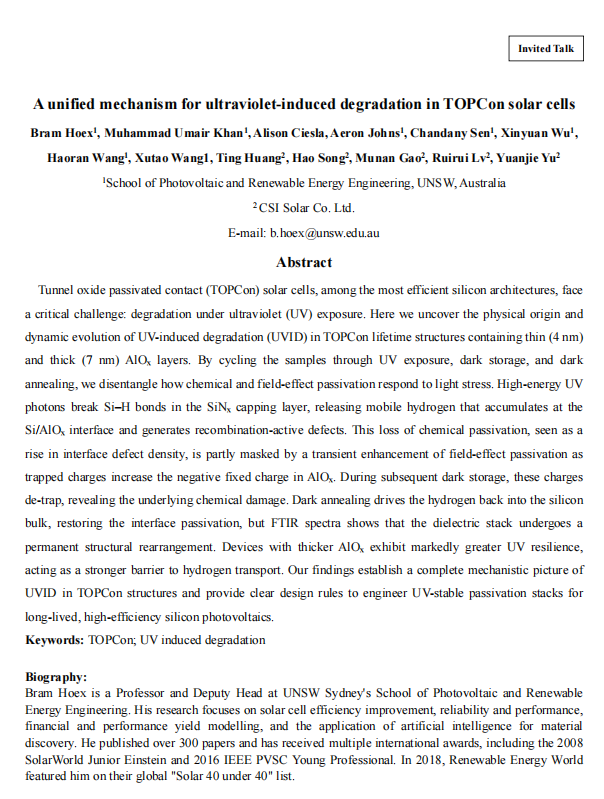 A unified mechanism for ultraviolet-induced degradation in TOPCon solar cells【Bram Hoex】