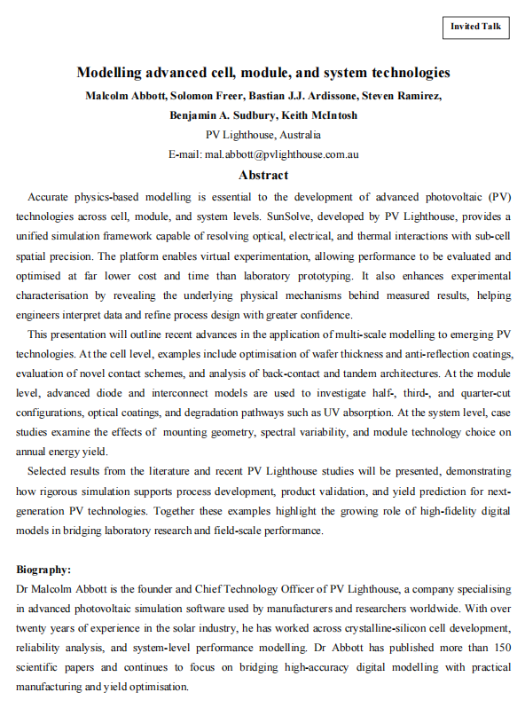 Modelling advanced cell, module, and system technologies【Malcolm Abbott】